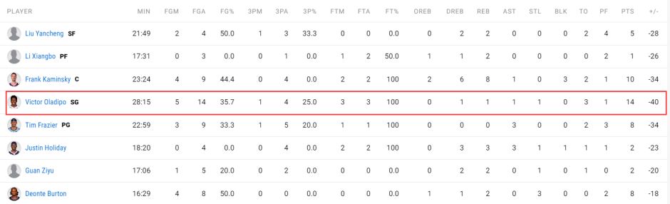 奥拉迪波28分钟,14中5,三分4中1,罚球3中3,拿到14分1篮板1助攻1抢断,命中率35.7%,三分命中率25%,正负值-40,奥迪这一场比赛算是被打爆了。