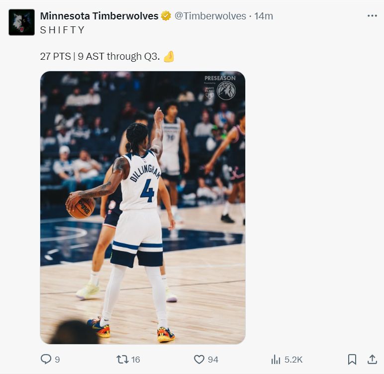 森林狼的先发后卫迪林厄姆三节27分钟打卡,14中10,三分4中4,罚球4中3,拿到27分9助攻2篮板2抢断仅1失误,命中率71.4%,三分命中率100%,这才是核心应该有的表现。