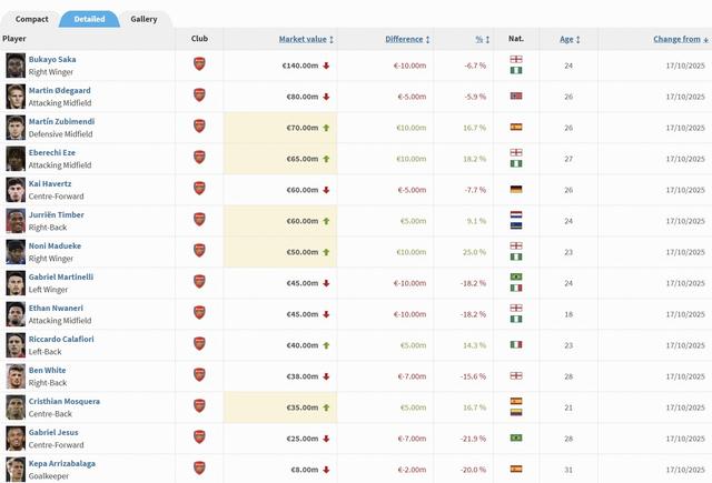 北京时间10月17日,德转更新了英超球员身价,阿森纳身价变动球员如下。
