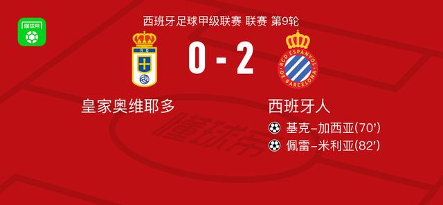 北京时间10月18日,西班牙足球甲级联赛第9轮,皇家奥维耶多主场迎战西班牙人。比赛中,基克-加西亚为西班牙人率先打破僵局,帮助球队取得领先。随后,奥马尔-希拉利送出助攻,佩雷-米利亚接球后冷静施射得手,进一步扩大比分优势。最终,西班牙人以2比0客场战胜皇家奥维耶多,全取三分。