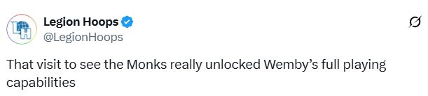 美媒Legion Hoops点评文班的表现时写道:“那次拜访武僧的经历,确实彻底激发了文班亚马的全部能力。”