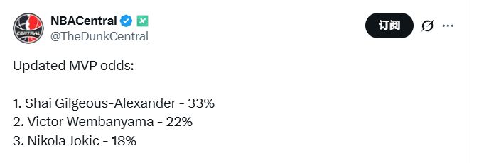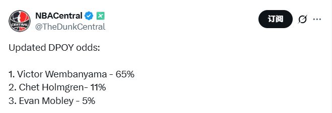 在常规赛MVP的获奖概率榜中,雷霆核心亚历山大33%的概率,排名联盟第一,文班亚马的获奖概率为22%,排名第二;约基奇的获奖概率为18%,排名联盟第三。而在DPOY的获奖概率榜上,文班亚马65%断层领先,排在第二的是霍姆格伦的11%,位居第三的莫布利是5%概率。