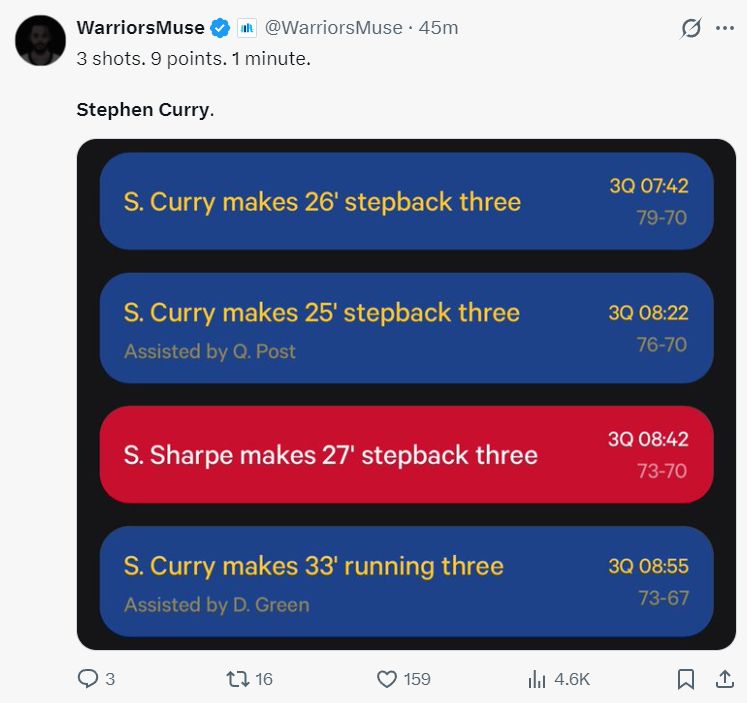 第三节库里在8分55-7分42秒这1分多钟里连续命中三个三分球,你们没有看错,就是连续三个三分球拿到9分,1分钟拿9分,第三节他单节三分6中4拿到12分2助攻1篮板1抢断。