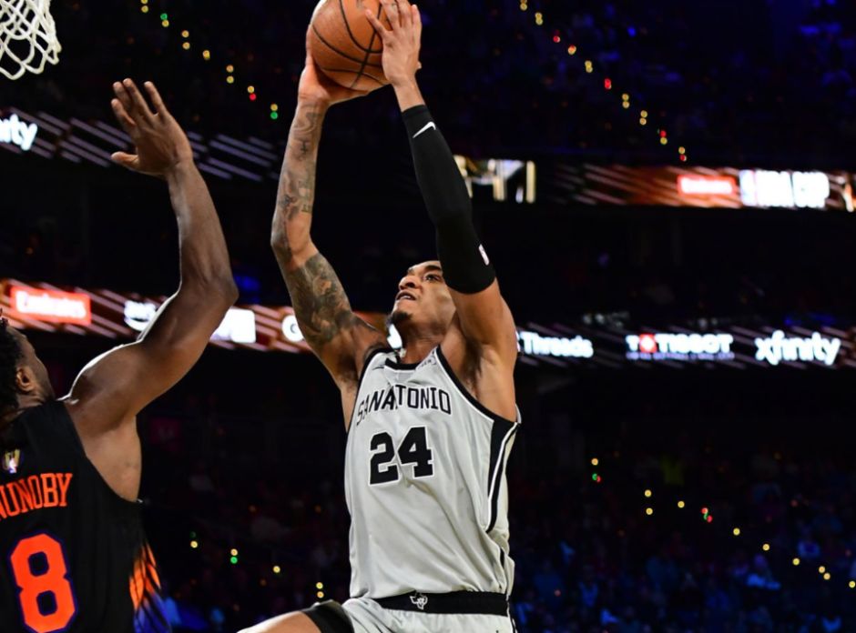 末节,罗宾逊补扣得分,克拉克森连中两记三分,尼克斯一波8-0反超马刺。福克斯两罚一中,阿奴诺比三分命中,布伦森连中两球。卡斯尔上篮得分,罗宾逊、科内特补篮得分,卡斯尔三分命中,马刺还落后3分。克拉克森抛投命中,文班亚马两罚两中,布伦森抛投命中,哈特、哈珀互飙三分。布伦森回场失误,阿奴诺比三分再中。科勒克封盖福克斯,最终,尼克斯击败马刺,夺得本届NBA杯赛冠军。