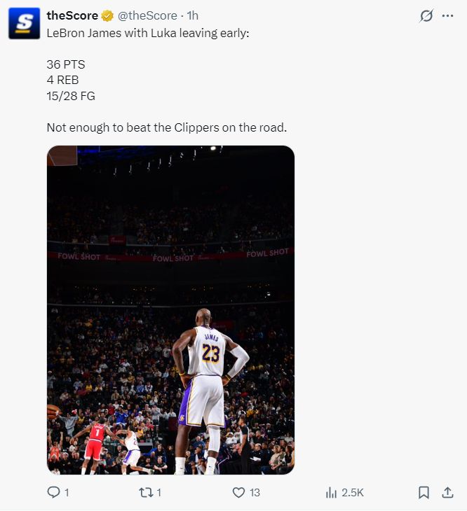 赛后美媒The Score晒出詹姆斯背影的落寞瞬间,36分4篮板已经不足以击败洛杉矶快船队。