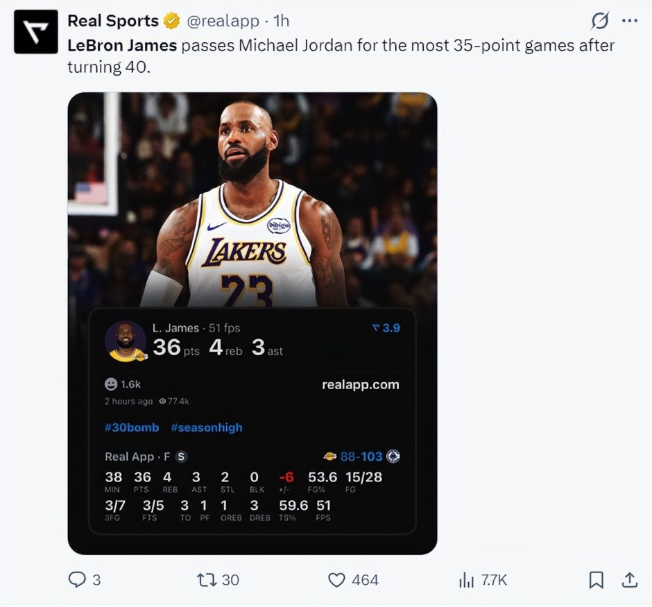 这场比赛勒布朗-詹姆斯虽然未能帮助球队拿下胜利,但他作为一位即将41岁的老将拿到35+的数据又创造多项纪录: