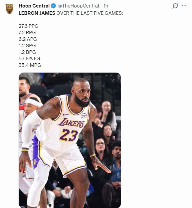 最近五场比赛的勒布朗更是炸裂,场均35.4分钟,拿到27.6分7.2篮板6.2助攻1.2抢断1.2盖帽,命中率53.8%,这像是一个即将41岁的老头子吗?如今谁还说他不值得5200万,徐静雨都说看了勒布朗这场的表现只能说尊重。