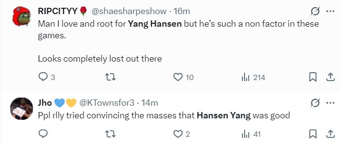 随后国内的一些博主、球迷开始喷杨瀚森了:首先杨瀚森需要练三分,他需要外线威胁,现在远投效率太低,另一方面运气也差,几个球都防到位了对手还是投进。