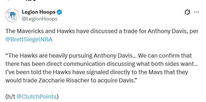 独行侠对交易戴维斯的想法同样十分开放。老鹰则已准备好与特雷-杨分道扬镳,且拥有里萨谢等筹码,足以向独行侠开出极具吸引力的报价。