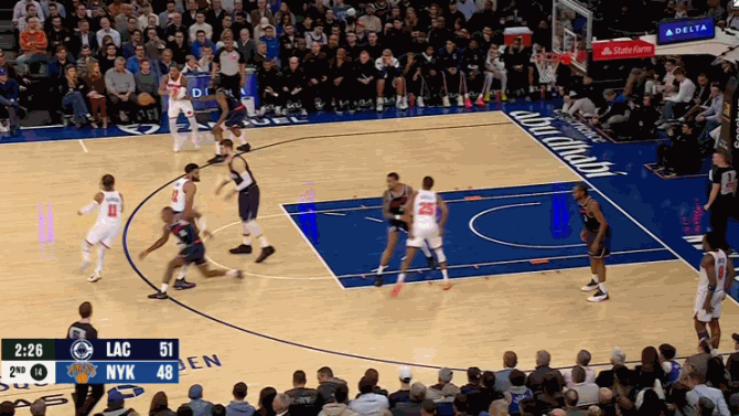 次节,麦克布莱德三分命中,莱昂纳德、乔丹-米勒也在外线还以颜色。罗宾逊空接扣篮,祖巴茨勾手得分,哈登三分命中,布里奇斯、克拉克森也中投得手,双方比分紧咬。布伦森三分命中,莱昂纳德手感火热,抛投命中,中投得分,随后一记快攻三分,一人连得7分,快船领先5分。半场结束,快船56-51领先尼克斯,莱昂纳德上半场已经得到21分,哈登12分5助攻,祖巴茨10分4篮板。尼克斯一方,麦克布莱德14分,布伦森10分。